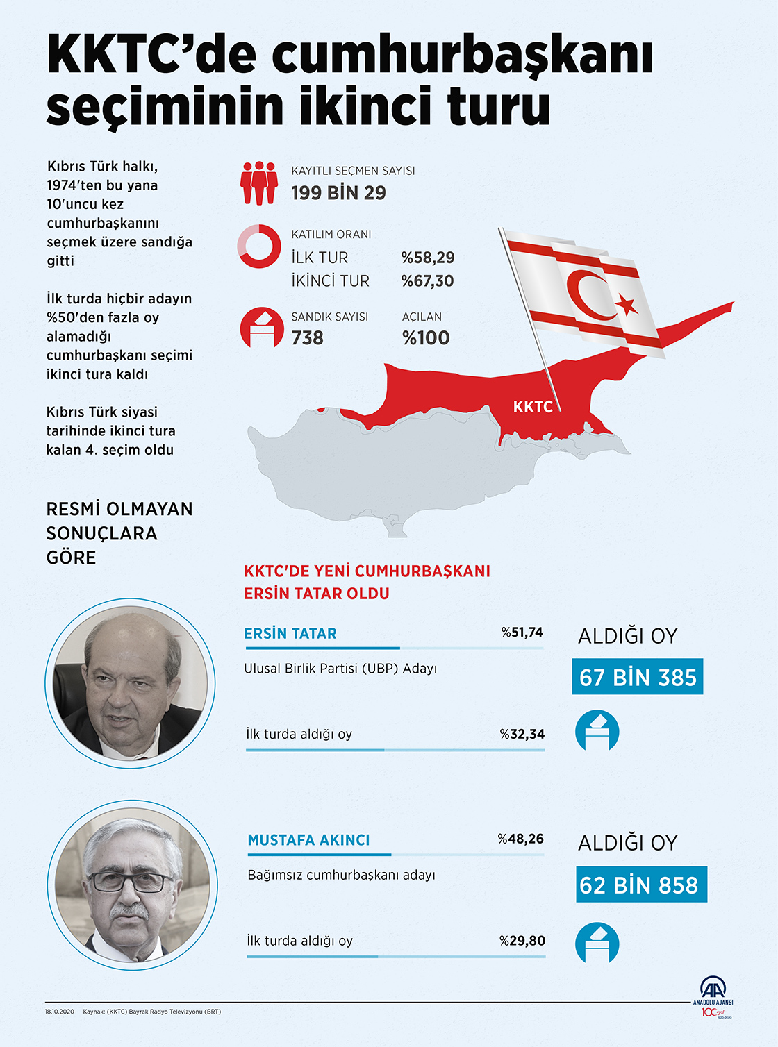 Kuzey Kıbrıs Türk Cumhuriyeti’nde (KKTC) yapılan cumhurbaşkanı ikinci tur seçiminde, resmi olmayan sonuçlara göre, Ulusal Birlik Partisi’nin (UBP) adayı Ersin Tatar oyların yüzde 51,69’unu alarak cumhurbaşkanı seçildi.